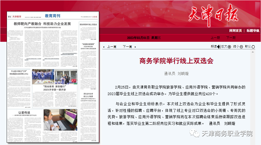 2月25日,由天津商务职业学院旅游学院、应用外语学院、营销学院共同举办的2023届毕业生线上双选会成功举办,为毕业生提供就业岗位420个。