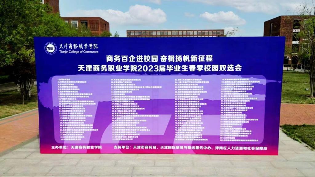 为深入学习贯彻党的二十大精神,推动“学习贯彻习近平新时代中国特色社会主义思想主题教育”走深走实,全面落实党中央、国务院“稳就业”“保就业”决策部署及市教育两委“关于开展2023届毕业生春季促就业攻坚行动”的有关要求,在天津市商务局、天津国际贸易与航运服务中心、津南区人力资源和社会保障局的大力支持下,4月15日,天津商务职业学院成功举办“商务百企进校园、奋楫扬帆新征程” 2023届毕业生春季校园双选会。