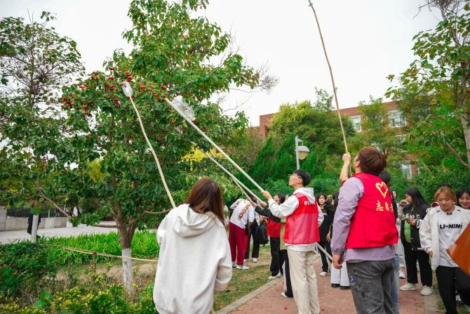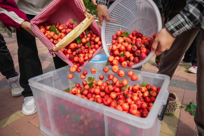 学生们在树木养护师傅、劳动教育课任课教师和辅导员老师的具体指导下,自制采摘工具,分组进行山楂树采摘劳动体验,共同享受丰收的喜悦。经过师生员工近4个小时的共同努力,共计采摘收获山楂约300斤,红彤彤的劳动果实装满了篮子,学生们抱着满筐山楂拍照留念,用镜头记录下劳动的喜悦!
